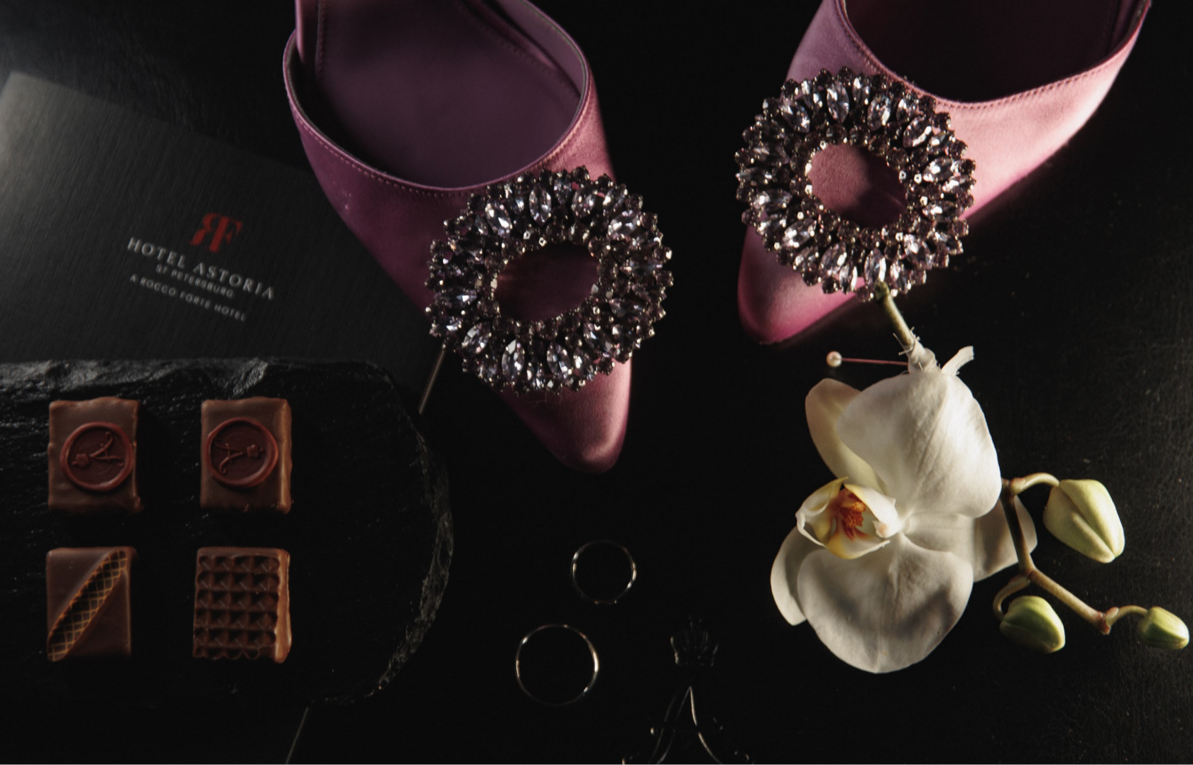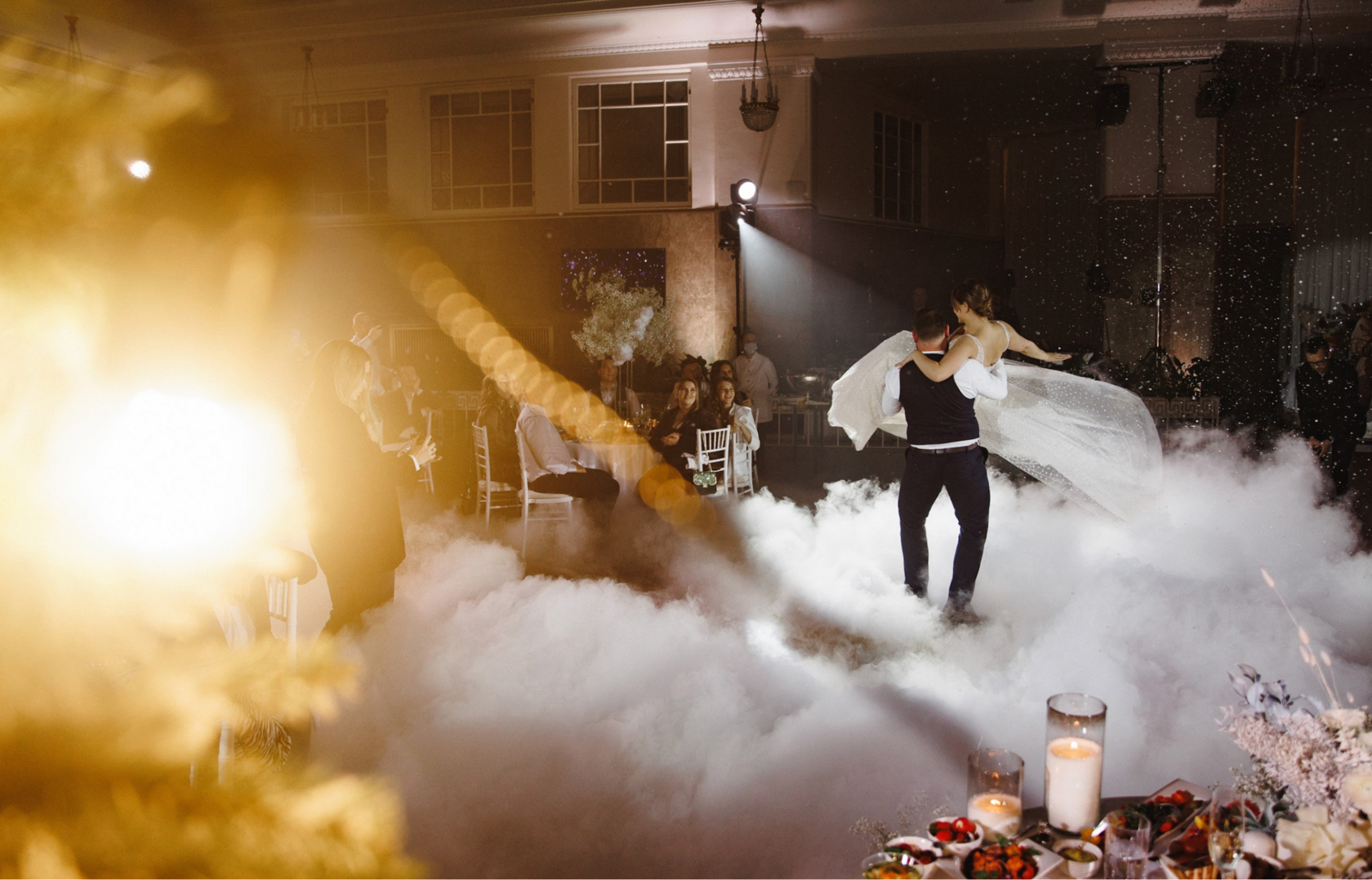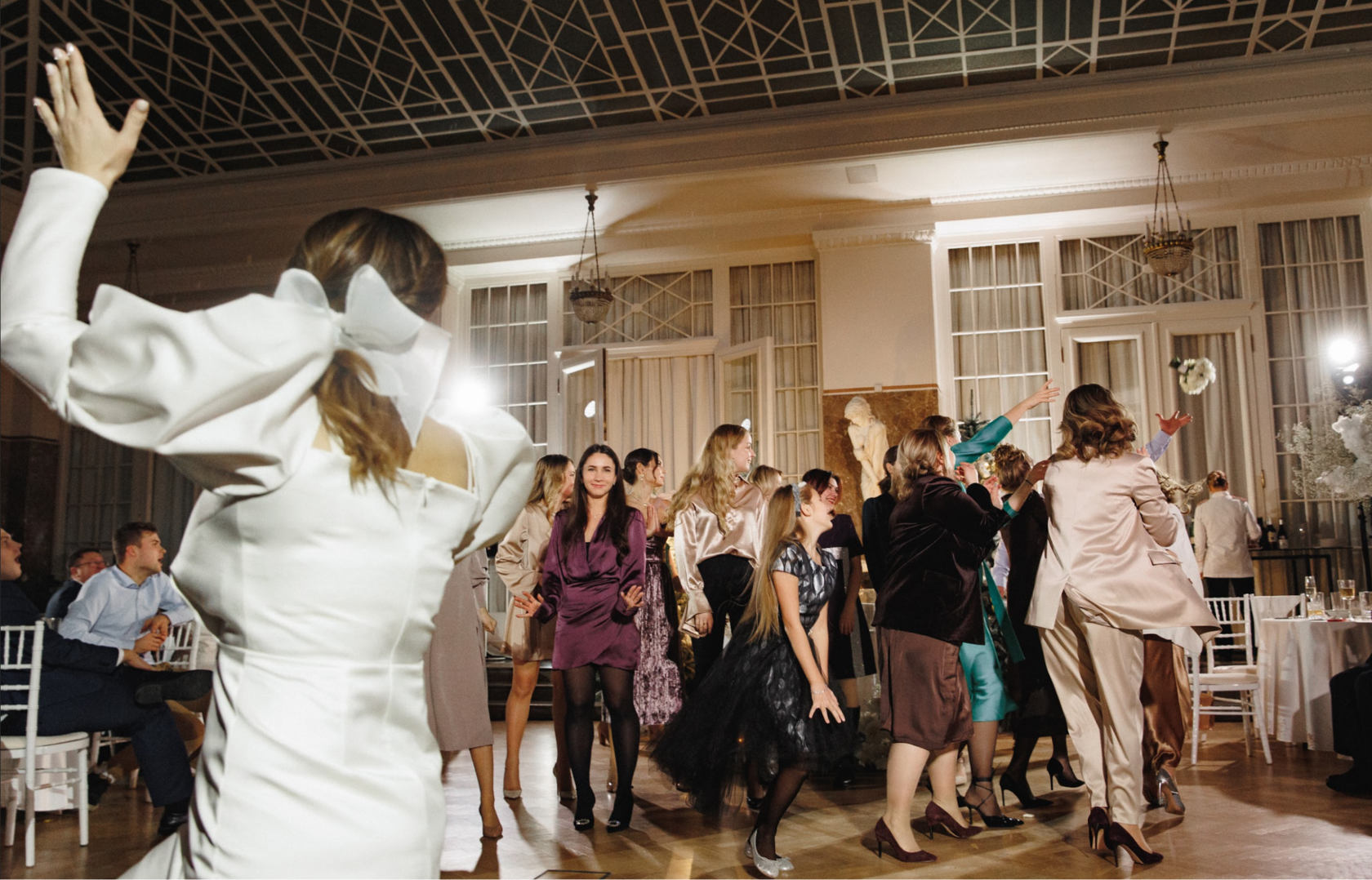 Далее в гостинице «Астория», гости погрузились в мир изысканных угощений и трогательных поздравлений. Ужин был неповторимым, а атмосфера веселья и радости наполнила зал. На танцполе царила живая энергия — под веселую музыку все гости, включая молодоженов, танцевали до глубокой ночи, создавая моменты, полные счастья.