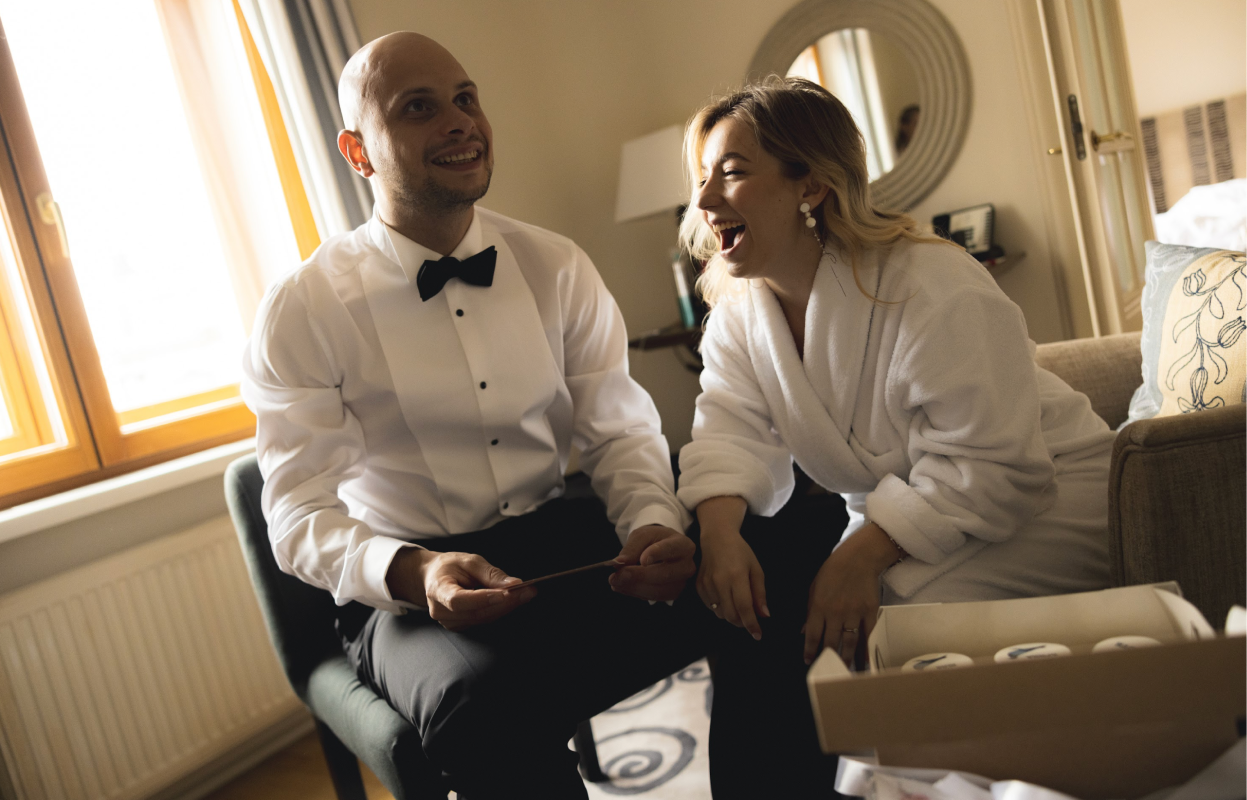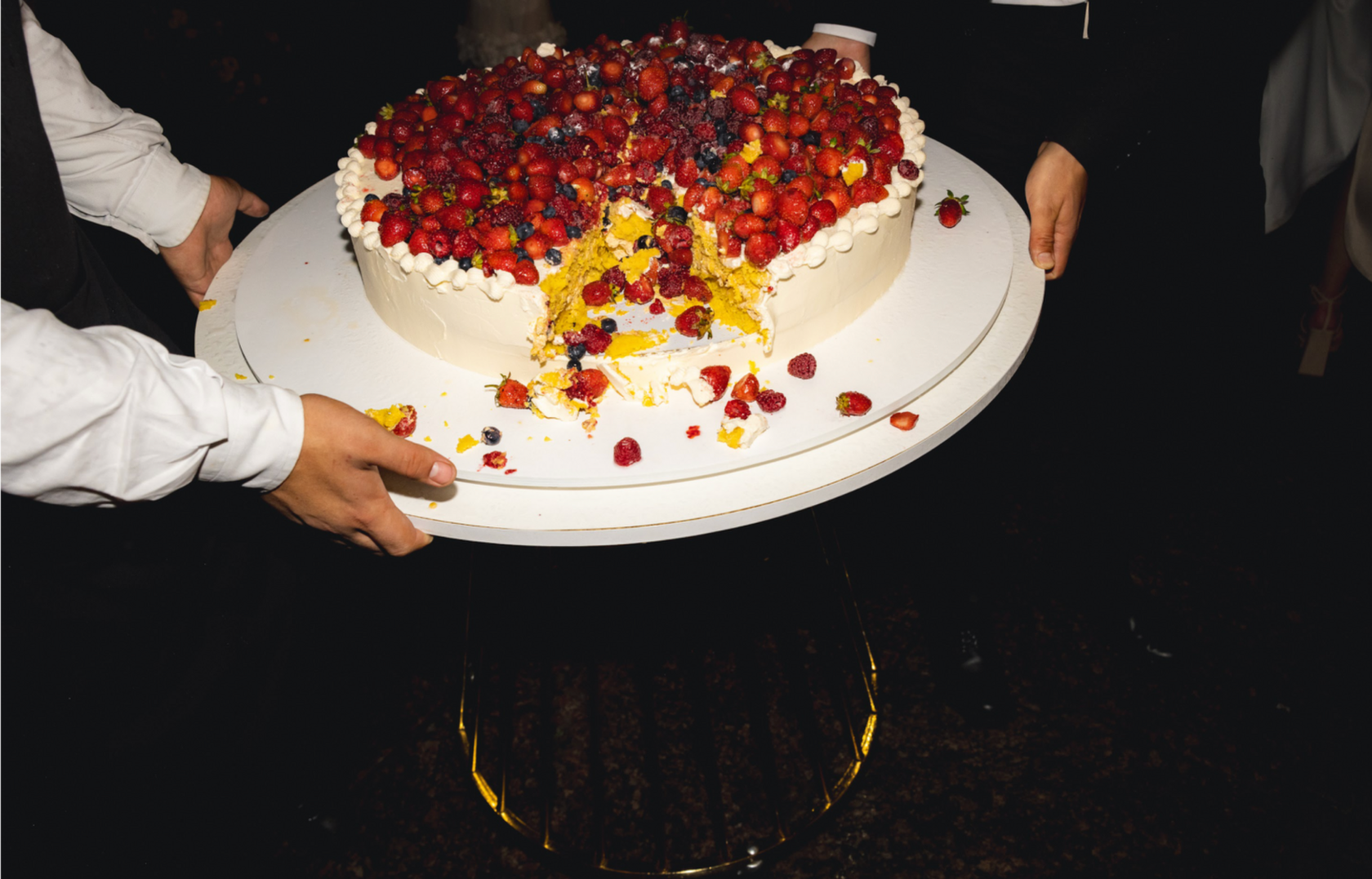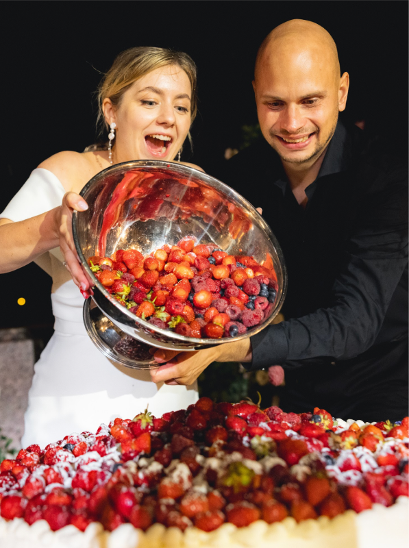 Меню на свадебном ужине было тщательно подобрано, чтобы завоевать сердца гостей и перенести их вкусами в Италию. Декор, выполненный в теплых желтых оттенках, вместе с живыми цветами создавал уютную атмосферу, напоминал о летнем пейзаже средиземноморской страны. И какой же праздник без десерта? Наты и Федя сами украсили торт в виде традиционного итальянского пирога ягодами — этот момент стал особенно трогательным и запоминающимся.